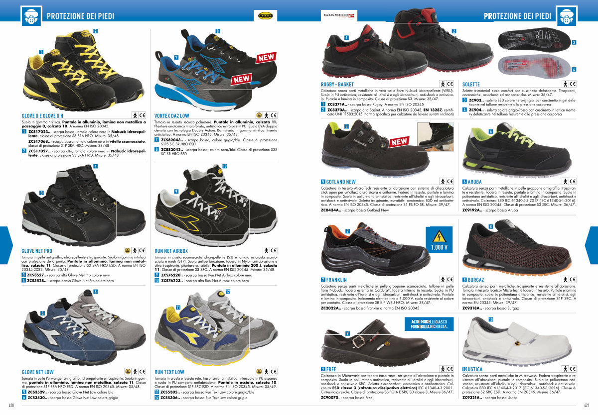 Tomaia in crosta e tessuto rete, traspirante, antistatica. Intersuola in PU espanso e suola in PU compatto antiabrasione. Puntale in acciaio, calzata 10. Classe di protezione S1P SRC ESD. A norma EN ISO 20345. Misure: 35 / 49.