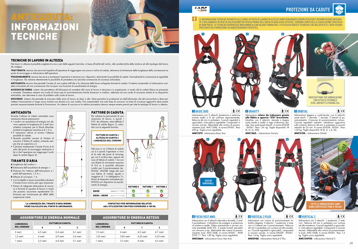 Nel caso in cui il fattore di caduta sia 0 e quindi l’ operatore si trovi al di sotto del punto di ancoraggio con il cordino teso, oppure nel caso di fattore di caduta 1 ma con una libertà di movimento massima di 0,6 m, è possibile utilizzare cordini per il posizionamento( es. EN354- EN358). Negli altri casi con fattore di caduta uguale o maggiore di 1 è obbligatorio l’ u- tilizzo di dispositivi anticaduta( es. EN355) con dispositivo di assorbimento di energia.