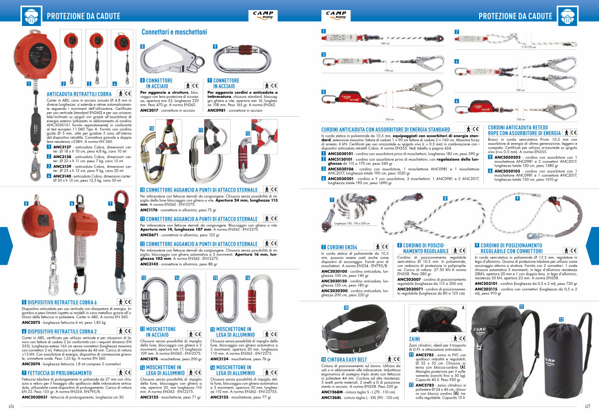 Carter in ABS, certificato per utilizzo verticale e per situazioni di lavoro con fattore di caduta 2( in conformità con i requisiti dinamici EN 355). Lunghezza estesa 165 cm senza connettori( lunghezza massima con connettori 2 m). Fettuccia in poliestere da 46 mm. Carico di rottura > 15 kN. Con assorbitore di energia, dispositivo di connessione girevole, connettore ovale. Peso 1,25 kg. A norma EN 360.