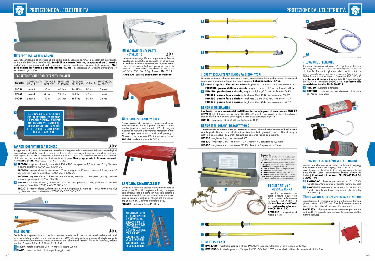 Attrezzi ad alto isolamento in resina sintetica rinforzata con fibre di vetro. Paramano di delimitazione e tappo di chiusura. Gancio filettato in acciaio rivestito da guaina in plastica. Il fioretto lungo 4 metri è in due spezzoni da 2 metri cadauno con raccordo rapido di giunzione.