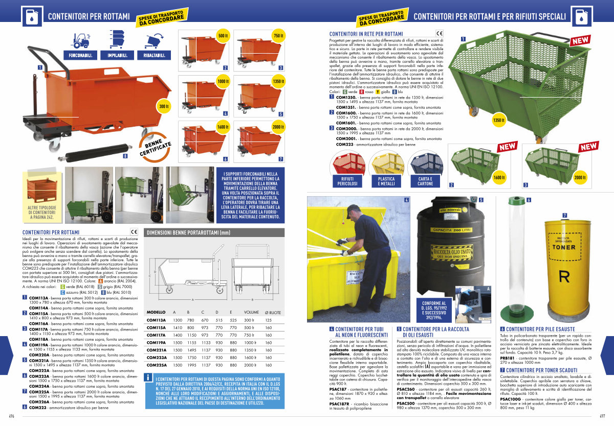 Contenitore per la raccolta differenziata di tubi al neon e fluorescenti, realizzato completamente in polietilene, dotato di coperchio incernierato e richiudibile e di bisaccione flessibile interno asportabile. Base pallettizzata per agevolare la movimentazione. Completo di asta reggi coperchio. Coperchio lucchettabile con catena di chiusura. Capacità 900 lt.