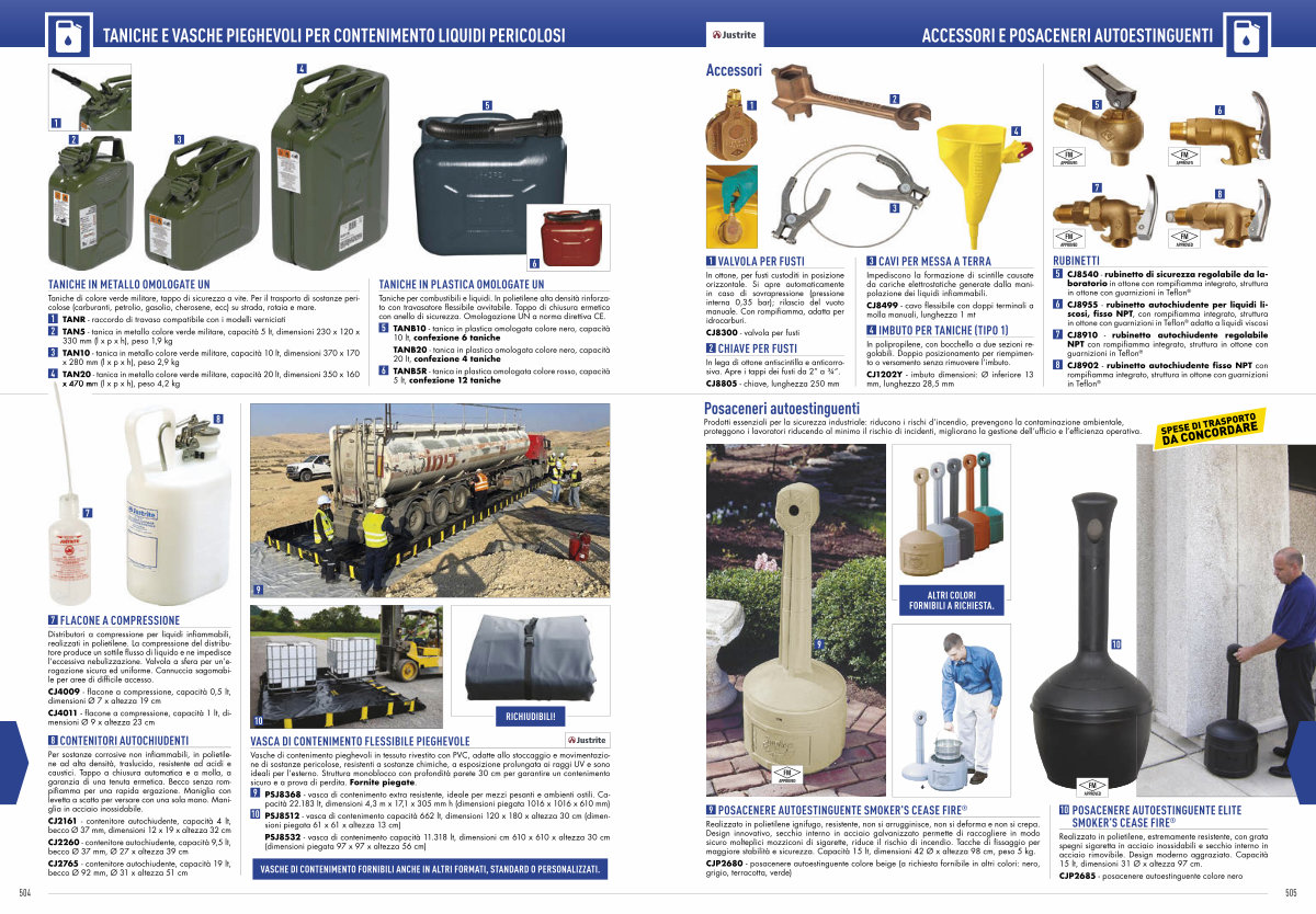 Taniche per combustibili e liquidi. In polietilene alta densità rinforzato con travasatore flessibile avvitabile. Tappo di chiusura ermetico con anello di sicurezza. Omologazione UN a norma direttiva CE.