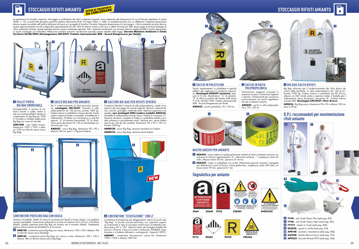 Sacchi regolamentari in polietilene e speciali additivi per migliorare la resistenza meccanica. Omologati UN5H4Y( amianto). Spessore 0,15 mm. Marchiatura:“ a” di amianto,“ R” di rifiuto e simbolo del trattato ADR classe 9. D. M. 06 / 09 / 1994. Trattato internazionale ADR- Accord Dangereuses par Route.
