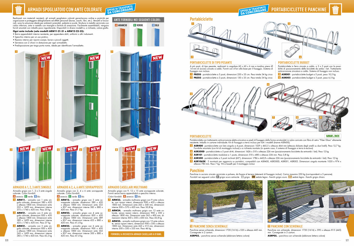 Realizzati con materiali resistenti, gli armadi spogliatoio colorati garantiscono ordine e praticità per organizzare e proteggere abbigliamento ed effetti personali( borse, caschi, libri, etc.). Versatili e funzionali, sono la soluzione ideale per ambienti aziendali, palestre e scuole. Struttura in metallo verniciato con rialzo inferiore, ante in metallo con maniglie e feritoie di areazione. Facilmente assemblabili, vengono forniti smontati con imballo poco ingombrante. Disponibili in diversi modelli e, a richiesta, colore giallo.