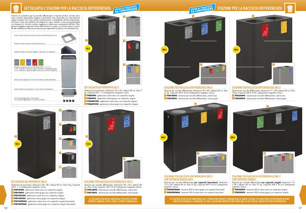 Stazione per raccolta differenziata con coperchi singoli, dimensioni 115 x 38 x altezza 80 cm. Peso 27 kg. Capacità 300 lt. Kit di 5 pittogrammi magnetici incluso.