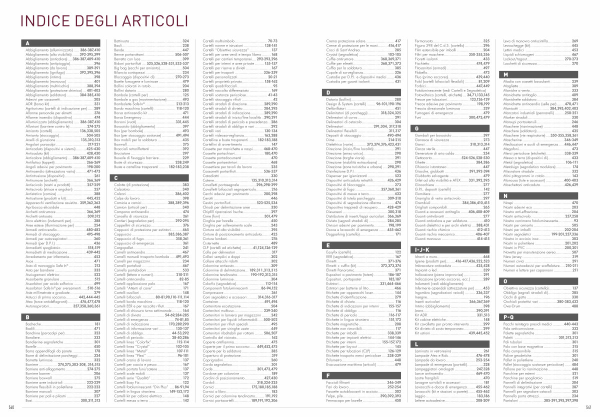 Datario( bollini)....................................... 280 Design & System( cartelli)........ 96-101,190-196 Defibrillatori........................................... 451 Delimitatori( di parcheggi).......... 318,324,325 Delineatori di curva................................. 291 Delineatori di ostacolo............................. 304 Delineatori.......................... 291,304, 317,318 Delineatori flessibili............................ 311,317 Depositi di stoccaggio...................... 490-494 Dime............................................... 214-215 Dielettrico( varie)............ 373,374,376,423,431 Direzione( inizio / fine località).................. 291 Direzione( senso unico)............................ 290 Direzione( targhe viarie).......................... 291 Direzione( viabilità extraurbana)............... 290 Direzione( zone turistiche e urbane).... 290,291 Disinfezione D. P. I.................................... 436 Dispenser per igienizzanti........................ 523 Dispositivi anticaduta retrattili............. 426,429 Dispositivi di bloccaggio.......................... 273 Dispositivi di fuga....................... 357,360,361 Dispositivi di messa a terra....................... 433 Dispositivi di tutela parcheggio........... 309-310 Dispositivi di segnalazione allarme........... 474 Dispositivo treppiedi di recupero........ 428-429 Dissuasori........................................ 300,318 Distributore di inserti / tappi auricolari.. 366,369 Divieto( segnali stradali di)................ 284,285 Divisori adesivi per pavimento............ 198,199 Docce e lavaocchi di emergenza....... 455-462 Dogparking( cartello)............................... 171