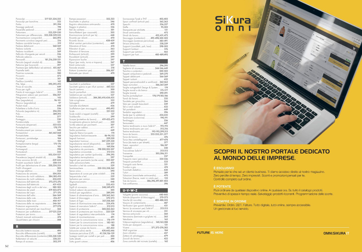 Sacchetti in polietilene............................. 237 Sacchetti igienici e per rifiuti sanitari... 447,523 Sacchi zavorra....................................... 300 Sacchi portarifiuti.................................... 533 Saldatrice per sacchetti............................ 237 Saldatura( articoli)......... 384,385,410,434,435 Sale scioglineve...................................... 332 Salvagenti.............................................. 479 Salviette disinfettanti................................ 436 Scaffalature( per stoccaggio)............. 490,492 Scale............................................... 231-232 Scale mobili e tappeti( cartelli).................. 137 Scaldacollo............................................ 399 Scarpe( protettive da lavoro)....... 419-423,472 Scioglimento ghiaccio( articoli per)........... 332 Scritte adesive per pavimenti.................... 207 Secchio per sabbia................................. 471 Sedia portantina..................................... 449 Segnale libero / occupato......................... 174 Segnaletica fotoluminescente........... 86-94,152 Segnali luminosi................................ 329,330 Segnalatori luminosi................... 247,329,330 Segnalazione veicoli( dispositivi)........ 334-337 Segnaletica a mezzaluna................... 169,206 Segnaletica da pavimento.... 198-200,205-207 Segnaletica orizzontale..................... 212-215 Segnaletica per cantieri( polionda)...... 294,295 Segnaletica termoplastica........................ 297 Segnali per pavimento( scritte varie)... 205-207 Sella salvamanichetta.............................. 470 Semafori a led da cantiere....................... 329 Semimaschere..................... 350-355,358,362 Senso unico............................................ 290 Separatore di corsie per piste ciclabili....... 318 Sequenziale a led................................... 329 Serbatoio per camion.............................. 340 Sfigmomanometro................................... 448 Sgabelli.......................................... 233,453 Sigilli di sicurezza...................... 248,249,470 Simboli adesivi da pavimento................... 205 Simboli per segnaletica...................... 289,290 Sistemi di alimentazione d’ aria.... 359,362,363 Sistemi di bloccaggio....................... 270-273 Sistemi di fuga........................... 357,358,360 Sistemi di illuminazione aree estese..... 254,476 Sistemi di marcatura Safe In ®.............. 212-213 Sistemi di protezione.................. 260,262,263 Sistemi di protezione per macchine.... 225-229 Sistemi di segnaletica intercambiabile....... 174 Sistemi di movimentazione....................... 491 Sistemi per la comunicazione visiva.... 176-179 Sistemi per la comunicazione visiva.... 182-183 Sistemi per la comunicazione visiva.......... 188 Solette per scarpe da lavoro............... 421,422 Soluzione salina sterile............... 439,445,446 Sostanze pericolose( CLP)........ 41,124,126-129 Sostegni mobili per cartelli e per pali........ 300 Sotto elmetti............................................ 399 Sotto guanti cotone................................. 406