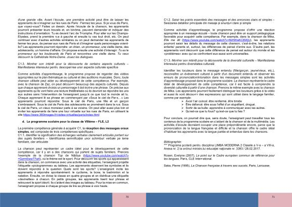 Comme activités d ’ apprentissage , le programme propose d ’ offrir une réaction appropriée à un message écouté – toute chanson peut être un support pédagogique favorable pour acquérir cette compétence . Par exemple , dans la chanson de Mika , Elle me dit ( https :// www . youtube . com / watch ? v = NiHWwKC8WjU ), les apprenants pourront saisir les détails du message de cette chanson , c ’ est-à-dire , les relations enfants / parents et , surtout , les différences de pensé d ’ entre eux . D ’ autre part , les apprenants vont découvrir que cette différence de pensé est autour du monde et les « problèmes » avec qui se confrontent eux-aussi sont universelles .