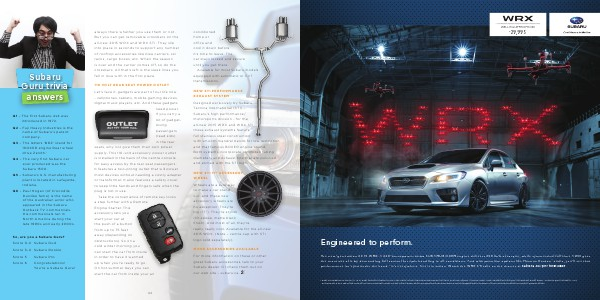 * MSRP of $29,995 on 2015 WRX (FY1 W0). MSRP excludes Freight & PDI of $1,650. Taxes, license, registration and insurance are extra. $0 security deposit. Harman Kardon® is only available with the Sport-tech package. Model shown: 2015 WRX Sport Package (FY1 WS)