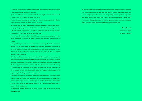 Què? –era la Montse, que en veure’m palplantada al mig de l’aula em convidava a dir