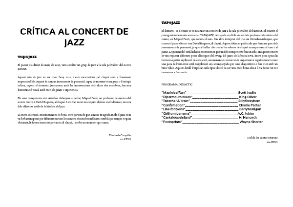 El dimarts, 17 de març es va realitzar un concert de jazz a la sala polivalent de l’institut. El concert el protagonitzava un trio anomenat TAP&JAZZ, dels quals un d’ells era un dels professors de música del centre, en Miquel Ferré, que tocava el saxo. Un altre intèrpret del trio era l’ArtashesAslanyan, que tocava el piano elèctric i en David Boquera, al claqué. Aquest últim es podria dir que formava part dels instruments de percussió, ja que al ballar i fer sonar les sabates de claqué acompanyava al saxo i al piano. Depenent de l’estil, hi havia moments en què un dels components feia un solo. En aquest concert es van repassar diferents peces clàssiques del swing, del jazz i de la bossa nova. Entre peça i peça hi havia una petita explicació de cada estil, anomenant els autors més importants i seguidament tocant una peça de l’esmentat estil. L’explicació era acompanyada per unes diapositives o fins i tot amb un breu vídeo. Aquest detall d’explicar cada tipus d’estil va ser una molt bona idea i li va donar un toc interesant a l’actuació.