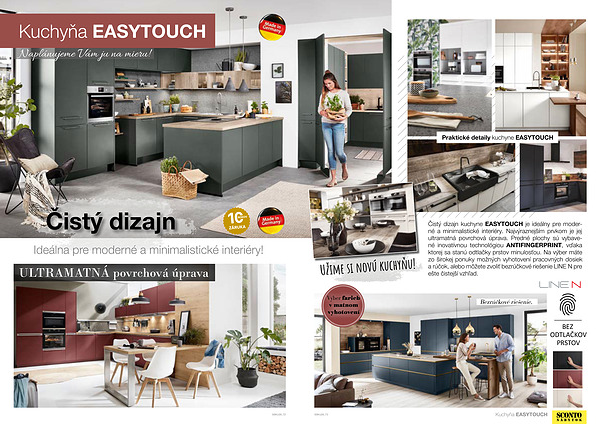 Kuchyňa SYLT je moderným variantom vidieckeho štýlu. Matné predné plochy vo forme dvierok a zásuviek je možné zvoliť vo svetlých dekoroch. Ku kuchyni sa skvele hodí obloženie verne pripomínajúce dlaždice, ktoré je zhotovené pomocou digitálnej tlače. Aby bola kuchyňa presne podľa vašich predstáv, máte na výber zo širokej ponuky rúčok a dekorov pracovnej dosky.