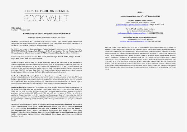 THE BRITISH FASHION COUNCIL ANNOUNCES NEW ROCK VAULT LINE-UP