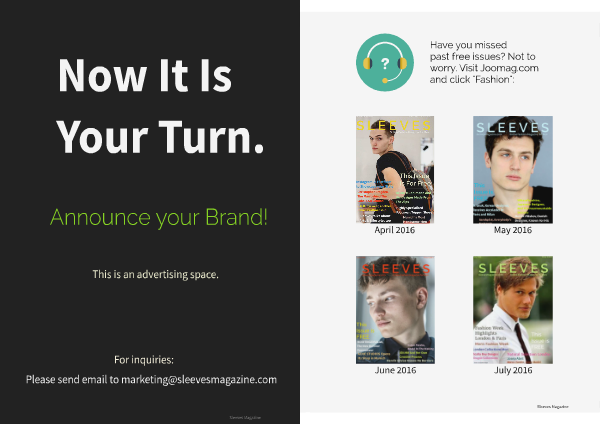 Have you missed past free issues? Not to worry. Visit Joomag.com and click "Fashion": April 2016 May 2016 June 2016 July 2016 Sleeves Magazine