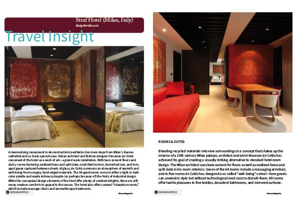 A mesmerizing monument to deconstructivist aesthetics lies mere steps from Milan ' s Duomo cathedral and La Scala opera house. Italian architect and fashion designer Vincenzo de Cotiis conceived of the hotel as a work of art— a grand scale installation. With bare cement floors and stairs, rooms featuring oxidized brass and split slate, scratched mirrors, burnished iron, and torn, aged gauze captured between sheets of glass, de Cotiis summons an atmosphere of warmth and well-being from scrappy, hard-edged materials. The 64 guestrooms come in either a light or dark color palette and exude intimacy despite( or perhaps because of) the hints of industrial design. While the conceptual design elements of the Straf offer plenty of cerebral delights, there are still many creature comforts to appeal to the senses. The hotel also offers several“ relaxation rooms,” which include massage chairs and aromatherapy treatments.
