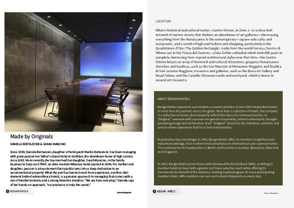 Design Hotels represents and markets a curated selection of over 290 independent hotels in more than 50 countries across the globe. More than a collection of hotels, the company is a collection of stories. Each property reflects the ideas of a visionary hotelier, an " Original," someone with a passion for genuine hospitality, cultural authenticity, thoughtprovoking design and architecture. Each " Original " stands for the individual, aesthetic and service-driven experience that his or her hotel provides.