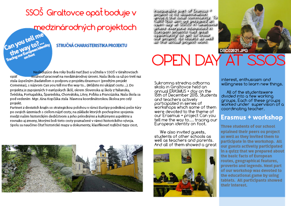 Inseparable part of Eramus + project is its dissemination among the local community. To fullfil this aim we prepared an open day at SSOS in Giraltovce