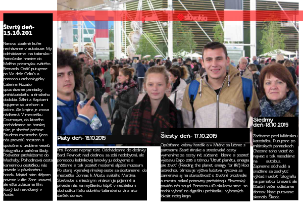 Opúšťame krásny hotelík a v Miláne sa lúčime s partnermi. Staré rímske a stredoveké cesty vymeníme za cesty iné, súčasné. Ideme si pozrieť výstavu Expo 2015 s témou "Uživiť planétu, energia pre život“. ("Feeding the planet, energy for life") Hoci ústrednou témou je výživa ľudstva, výstava sa zameriava aj na starostlivosť o životné prostredie a miesta, odkiaľ potraviny prichádzajú. Slovenský pavilón nás zaujal. Pomocou 3D okuliarov sme sa mohli vybrať na digitálnu prehliadku vybraných lokalít našej krajiny. A tak sme navštívili Košice, Spišský hrad...