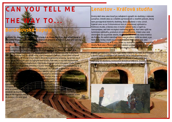 Druhý deň ráno sme hneď po raňajkách vyrazili do dedinky s názvom Lenartov. Stretli sme sa s ďalším sprievodcom a starším pánom, ktorý nám porozprával históriu dedinky. Bola založená v roku 1543. Vybrali sme sa na 5 kilometrovú túru k Lenartovej výhľadni a Kráľovej studni, z ktorej sme si mohli nabrať vodu a napiť sa. Samozrejme, ani tam nechýbal nádherný výhľad. Keď sme vyšli na turistickú výhľadňu, prebehol mi mráz po chrbte. Videli sme celé slovenské ale aj poľské okolie, keďže len 50 m od nás bola hranica do Poľska. Po veľmi náročnej túre sme sa všetci tešili na obed, a po ňom naše kroky viedli na posledné miesto Hervartov, kde sme navštívili firmu J a L & Š, s.r.o., ktorá sa zaoberala výrobou dreveného šindľa. Boli sme v dielni, kde nám ukázali postup výroby. A von pred dielňou sme videli výsledky - malé repliky drevených kostolíkov.