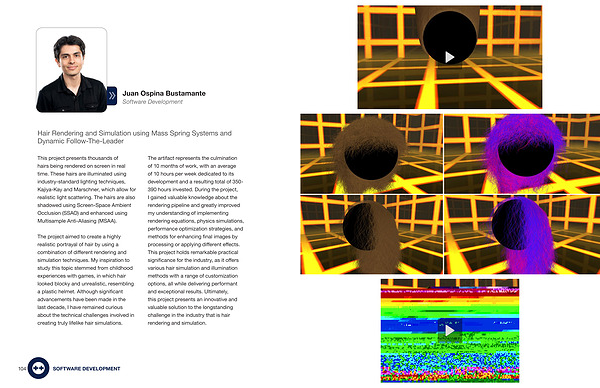 The artifact represents the culmination of 10 months of work , with an average of 10 hours per week dedicated to its development and a resulting total of 350- 390 hours invested . During the project , I gained valuable knowledge about the rendering pipeline and greatly improved my understanding of implementing rendering equations , physics simulations , performance optimization strategies , and methods for enhancing final images by processing or applying different effects . This project holds remarkable practical significance for the industry , as it offers various hair simulation and illumination methods with a range of customization options , all while delivering performant and exceptional results . Ultimately , this project presents an innovative and valuable solution to the longstanding challenge in the industry that is hair rendering and simulation .