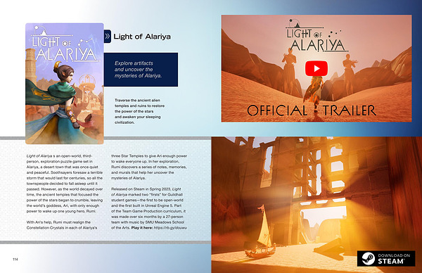 Released on Steam in Spring 2023 , Light of Alariya marked two “ firsts ” for Guildhall student games — the first to be open-world and the first built in Unreal Engine 5 . Part of the Team Game Production curriculum , it was made over six months by a 27-person team with music by SMU Meadows School of the Arts . Play it here : https :// rb . gy / douwu