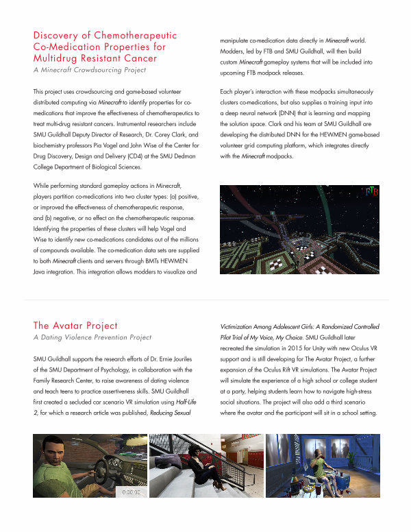 This project uses crowdsourcing and game-based volunteer distributed computing via Minecraft to identify properties for comedications that improve the effectiveness of chemotherapeutics to treat multi-drug resistant cancers. Instrumental researchers include SMU Guildhall Deputy Director of Research, Dr. Corey Clark, and biochemistry professors Pia Vogel and John Wise of the Center for Drug Discovery, Design and Delivery( CD4) at the SMU Dedman College Department of Biological Sciences.