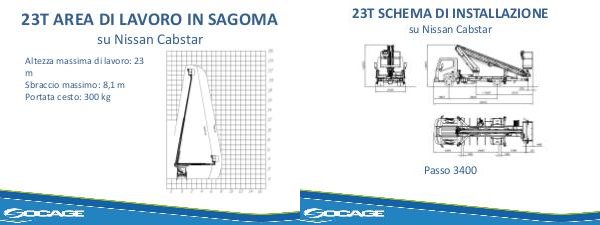 23T AREA DI LAVORO IN SAGOMA su Nissan Cabstar Altezza massima di lavoro: 23 m Sbraccio massimo: 8,1 m Portata cesto: 300 kg