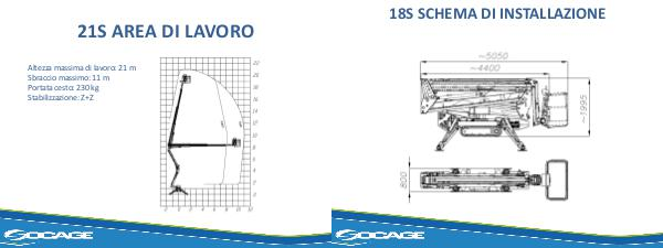 21S AREA DI LAVORO Altezza massima di lavoro: 21 m Sbraccio massimo: 11 m Portata cesto: 230 kg Stabilizzazione: Z+Z