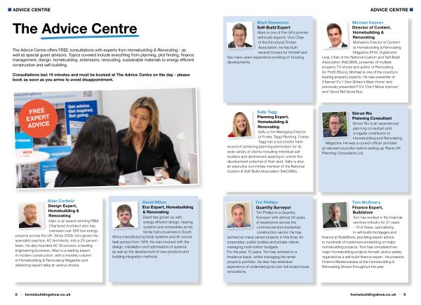 The Advice Centre offers FREE consultations with experts from Homebuilding & Renovating- as well as special guest advisors. Topics covered include everything from planning, plot finding, finance management, design, homebuilding, extensions, renovating, sustainable materials to energy efficient construction and self-building.