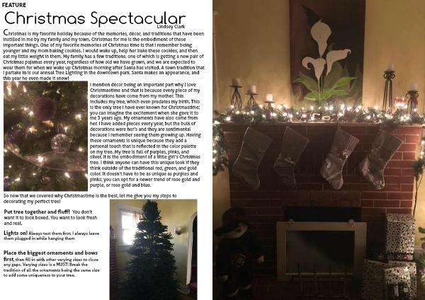 Christmas is my favorite holiday because of the memories, décor, and traditions that have been instilled in me by my family and my town. Christmas for me is the embodiment of these important things. One of my favorite memories of Christmas time is that I remember being younger and my mom baking cookies. I would wake up, help her bake these cookies, and then eat my little weight in them. My family has a few traditions, one of which is getting a new pair of Christmas pajamas every year, regardless of how old we have grown, and we are expected to wear them for when we wake up Christmas morning after Santa has visited. A town tradition that I partake in is our annual Tree Lighting in the downtown park. Santa makes an appearance, and this year he even made it snow!