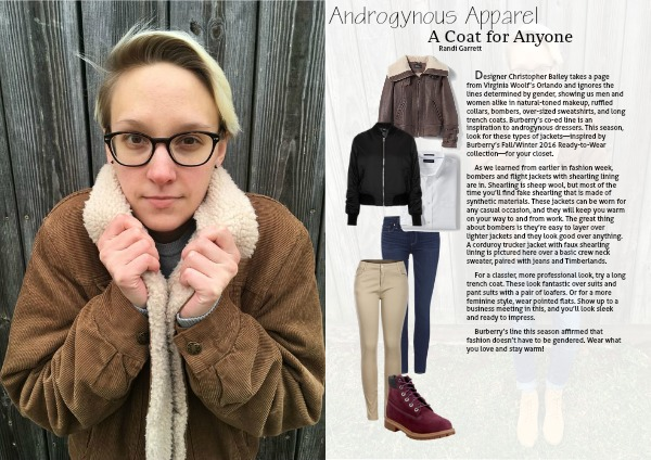 Designer Christopher Bailey takes a page from Virginia Woolf’s Orlando and ignores the lines determined by gender, showing us men and women alike in natural-toned makeup, ruffled collars, bombers, over-sized sweatshirts, and long trench coats. Burberry’s co-ed line is an inspiration to androgynous dressers. This season, look for these types of jackets—inspired by Burberry’s Fall/Winter 2016 Ready-to-Wear collection—for your closet.