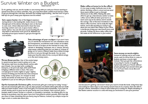 Just because it’s getting cold doesn’t mean you need to break the bank. Using these tips and looking for other ways to save money doesn’t have to be a hassle. Have fun with it and get creative. Remember to keep in mind what you’re saving for. Maybe dreaming of that warm summer vacation to come will keep you motivated to save your pennies!