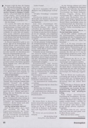 ^ Betimmt weißt Du über die Tagung des Weltdachverbandes und das Welttreffen in Cleveland / USA . Auch hat Dir Jakob Dinges über die geplante nächste Sitzung in Budapest erzählt . Und das soll ja nicht bloß eine Sitzung werden , sondern - weil ja auch für uns in Ungarn die 50-Jahre- Feierlichkeiten aktuell sind -ein Welttreffen unserer Donauschwaben mit Gedenkfeier usw . Die Zeit drängt . Ich schicke Dir anbei die Skizze meines Berichtes , den ich auf der Landesratsitzung vortragen wollte , bzw . im " Eiltempo ” auch vorgelesen habe , weil ja eben für wichtige Sachen nie Zeit vorhanden ist , wobei man sich stundenlang wegen subjektiv motivierten emoziellen Meinungsverschiedenheiten in den Haaren liegt und die Nerven der schlecht informier ten Anwesenden unnötigerweise auf reibt ...