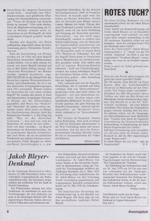 Doch nur eine Woche später ereignete sich gleich der zweite ( gewollte ?) Zufall . Die NZ brachte einen Bericht von Franz Kerner über das Schwabentreffen ( Festival ) in Mátészalka mit der Überschrift “ Ein Traum wurde verwirklicht ”. Nachdem die JBG Mitgestalter dieses Treffens war , hatte uns Herr Kerner sein Manuskript zwecks Kenntnismahme zugefaxt . Der Bericht ist in der NZ “ wortwörtlich ” erschienen - mit einer kleinen Ausnahme ! Zwei Zeilen des Originaltextes gingen verloren . Zufällig eben die zwei , die erklären sollten , wie die Tanzgruppe aus Harast / Dunaharaszti nach Mátészalka kam : “ Letztere kam durch die finanzielle Unterstützung der Donauschwäbischen Kulturstiftung , in Organisierung der Jakob Bleyer Gemeinschaft zum Treffen ”. Daß diese Formulierung nicht einwandfrei ist , soll jetzt nicht zur Debatte stehen . Komisch ist , daß die JBG totgeschwiegen wurde . Warum wohl ? Ist Jakob Bleyer das rote Tuch - oder die Gemeinschaft ? G . K .