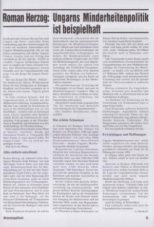 Roman Herzog sah während seines dreitägigen Besuches Ende Februar , was man ihm zeigte . Und er hörte , was man ihm sagte . Dementsprechend fiel die Meinungsbildung aus . Er traf mit dem Staatspräsidenten Árpád Göncz , der ihn eingeladen hatte , und mit dem Regierungschef Gyula Horn zusammen , nahm an einem Rundtischgespräch mit Volksgruppenführern teil , stattete in Schaumar einen Besuch ab und summierte seine Eindrücke auf einer Pressekonferenz und in einer Rede im Parlament . Sein Weg führte ihn aber auch in die Synagoge , vor der Holocaust-Überlebende auf Transparenten von Deutschland Entschädigung forderten , auf die Universität Budapest und nach Ostungam . Beim Rundtisch-Gespräch im noblen