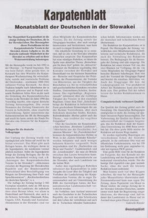 Die inhaltliche Gestaltung ist so orientiert , daß sie alle in der Slowakei lebenden Deutschen anspricht . Das Karpatenblatt hat seine ständigen Rubriken , zu denen die Spalte zum aktuellen Thema „ Betrachtungen für diese Zeit “ gehört . Im „ Infoservis “ informiert die Redaktion regelmäßig über Kontakte zwischen der Slowakei und Deutschland von der höchsten Staatsebene an - Besuche und Gespräche der Präsidenten , der Premierminister , der Vertreter von Ministerien , aus der Tätigkeit der Botschaften u . ä . bis zu wirtschaftlichen und gesellschaftlichen Kontakten zwischen Städten , Unternehmen , Schulen , Institutionen . Das regelmäßige „ Regionenmosaik “ informiert über die vielfältige Tätigkei des Vereins in den einzelnen Regionen . Unter dem Titel „ Schicksale “ bringt die Redaktion in belletristischer Form geschriebene Erinnerungen der aus der Heimat Vertriebenen , aber auch Schicksale deutscher Städte , Kirchen , Kultrudenkmäler . Hierher gehört auch das Thema ... was erzählen die vergilbten Fotografien “.