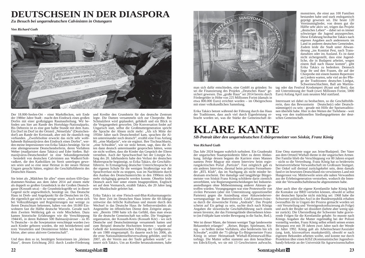 Sie leitet als „ Mädchen für alles” einen stolzen 650-Quadratmeter-Neubau aus dem Jahre 2014 auf einem mehr als doppelt so großen Grundstück in der Großen Deutschgasse( Kossuth utca) – die Grundstücksgröße sei in dieser Gegend nicht ungewöhnlich, bestätigt sie. Das Deutsche Haus ist Dreh- und Angelpunkt für die Deutschen im Ort, die eigentlich gar nicht so wenige seien: „ Auch wenn sich bei Volkszählungen und Registrierungen nur wenige zu ihrem Deutschtum bekennen, haben von den 18.000 Einwohnern fast die Hälfte deutsche Wurzeln. Gerade nach dem Zweiten Weltkrieg gab es viele Mischehen. Dazu kamen historische Erfahrungen wie die Verschleppung 1944 / 45, in deren Rahmen 500 Balmazújvároser- zu 85 % Deutsche- in die Sowjetunion verschleppt wurden( wo auch Kinder geboren wurden, die mit heimkehrten) und trotz Vorurteilen und Desinteresse bilden wir heute eine kleine, aber umso aktivere Gemeinschaft”.