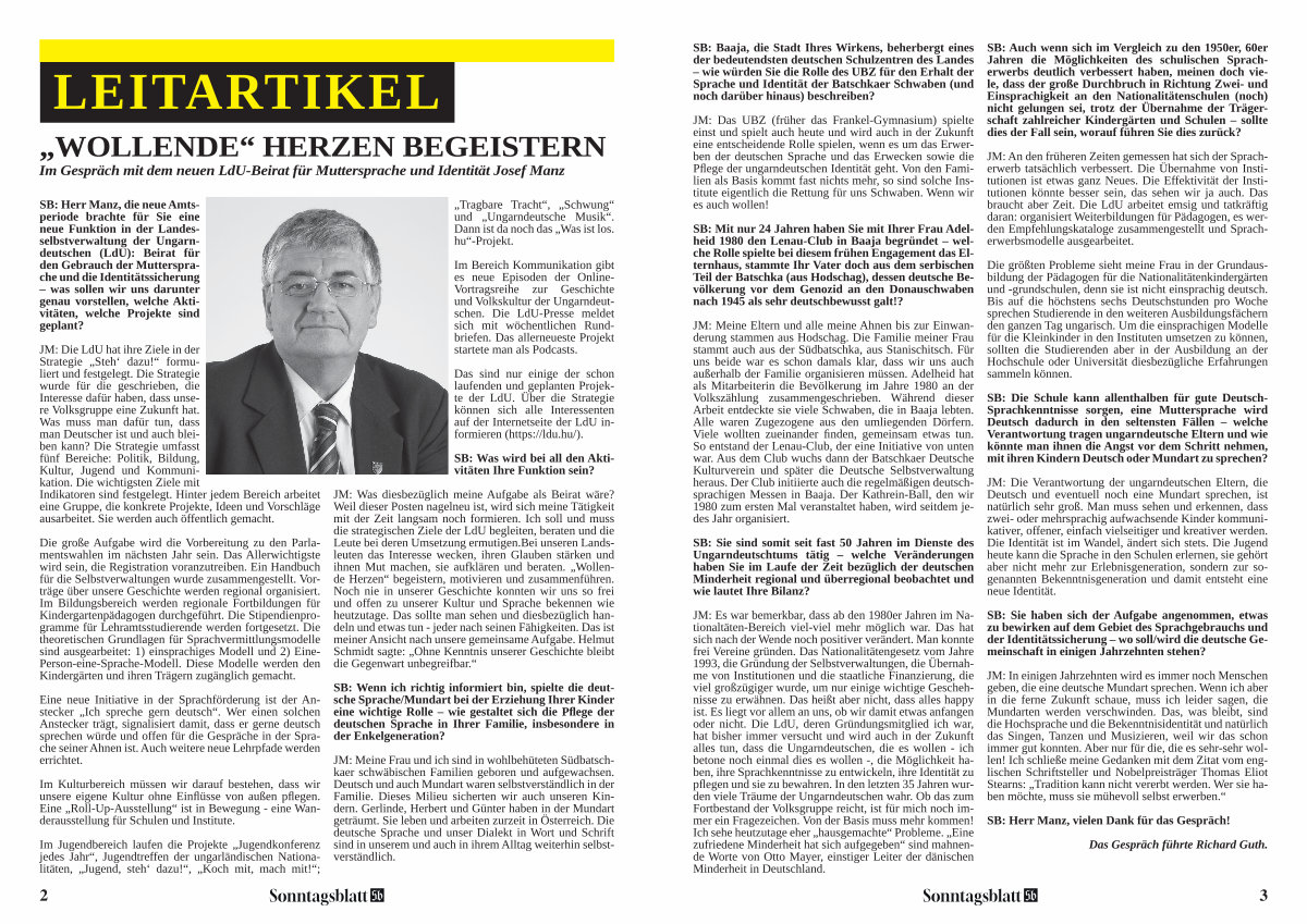 JM: Die Verantwortung der ungarndeutschen Eltern, die Deutsch und eventuell noch eine Mundart sprechen, ist natürlich sehr groß. Man muss sehen und erkennen, dass zwei- oder mehrsprachig aufwachsende Kinder kommunikativer, offener, einfach vielseitiger und kreativer werden. Die Identität ist im Wandel, ändert sich stets. Die Jugend heute kann die Sprache in den Schulen erlernen, sie gehört aber nicht mehr zur Erlebnisgeneration, sondern zur sogenannten Bekenntnisgeneration und damit entsteht eine neue Identität.
