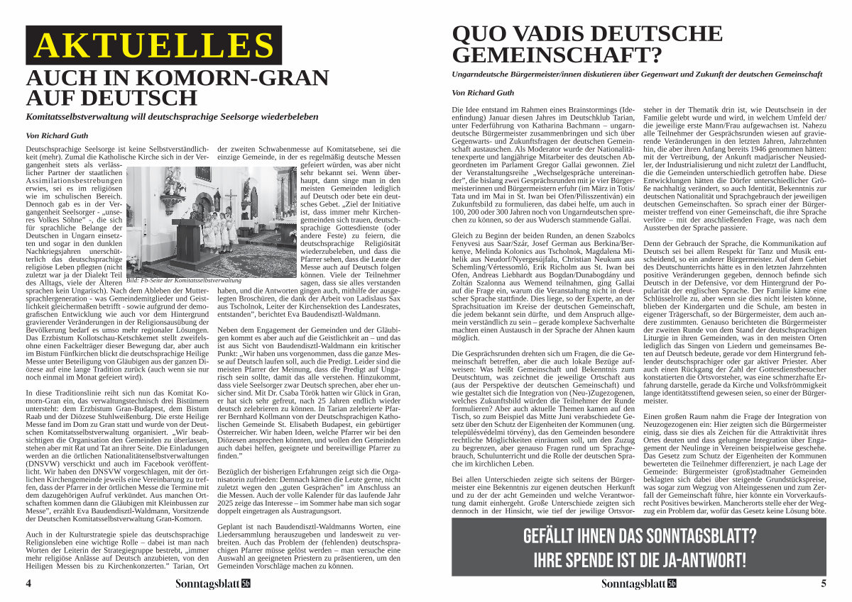 Die Gesprächsrunden drehten sich um Fragen, die die Gemeinschaft betreffen, aber die auch lokale Bezüge aufweisen: Was heißt Gemeinschaft und Bekenntnis zum Deutschtum, was zeichnet die jeweilige Ortschaft aus( aus der Perspektive der deutschen Gemeinschaft) und wie gestaltet sich die Integration von( Neu-) Zugezogenen, welches Zukunftsbild würden die Teilnehmer der Runde formulieren? Aber auch aktuelle Themen kamen auf den Tisch, so zum Beispiel das Mitte Juni verabschiedete Gesetz über den Schutz der Eigenheiten der Kommunen( ung. településvédelmi törvény), das den Gemeinden besondere rechtliche Möglichkeiten einräumen soll, um den Zuzug zu begrenzen, aber genauso Fragen rund um Sprachgebrauch, Schulunterricht und die Rolle der deutschen Sprache im kirchlichen Leben.