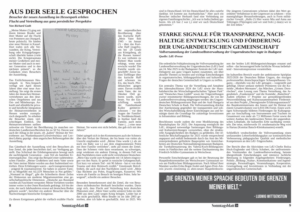 Beschlossen wurde zudem die erste Modifizierung des Haushaltsplans für 2025. Die Anpassung ermöglicht der LdU, dringend notwendige Sanierungen ihrer Bildungsund Kultureinrichtungen vorzuziehen, ohne die strukturelle Ausgeglichenheit des Budgets zu gefährden. Der öffentliche Beschaffungsplan für 2025 wurde entsprechend angepasst und enthält bedeutende durch das Amt des Ministerpräsidenten geförderte Bauprojekte wie Anstricharbeiten am Deutschen Nationalitätengymnasium Budapest, die Turnhallensanierung des Valeria-Koch-Bildungszentrums in Fünfkirchen und die weitere Dachsanierung des Friedrich-Schiller-Gymnasiums in Werischwar.