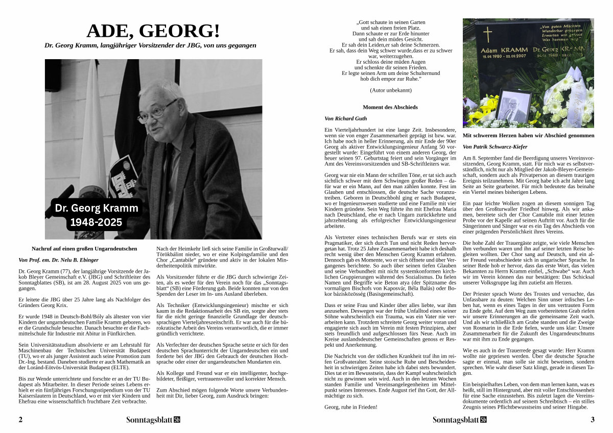 Dr. Georg Kramm( 77), der langjährige Vorsitzende der Jakob Bleyer Gemeinschaft e. V.( JBG) und Schriftleiter des Sonntagblattes( SB), ist am 28. August 2025 von uns gegangen.