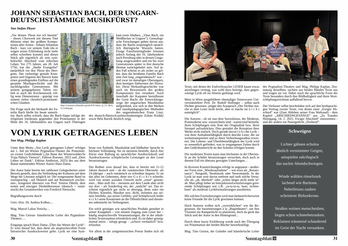 Mit solchen Formulierungen wird man bedauerlicherweise keine Freunde für die Lyrik gewinnen können. des Pygmalion-Theaters und Mag. Philipp Kaplan, Dramaturg desselben, suchten aus beiden Bänden Texte aus und trugen sie vor. Dabei stach die sprachliche Form der Texte besonders durch ihre Bildhaftigkeit und ihren Wortschöpfungsreichtum auffallend hervor.