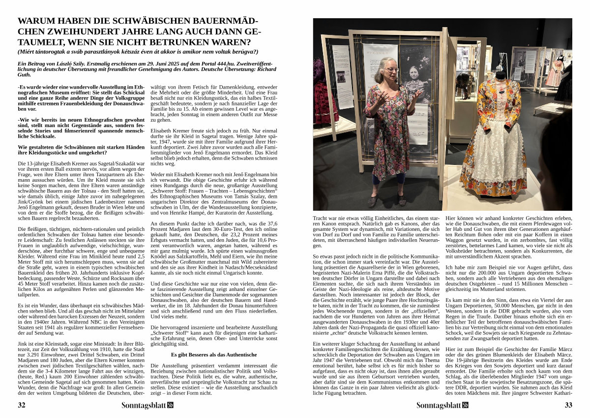 So etwas passt jedoch nicht in die politische Kommunikation, die schon immer stark vereinfacht war. Die Ausstellung präsentiert die Aquarellserie der in Wien geborenen, begeisterten Nazi-Malerin Erna Piffé, die die Volkstrachten deutscher Dörfer in Ungarn darstellte und dabei nach Elementen suchte, die sich nach ihrem Verständnis im Geiste der Nazi-Ideologie als reine, altdeutsche Motive darstellten. Noch interessanter ist jedoch der Block, der die Geschichte erzählt, wie junge Paare ihre Hochzeitsgäste baten, nicht in der Tracht zu kommen, die sie zumindest jedes Wochenende trugen, sondern in der „ offiziellen“, nachdem die vor Hunderten von Jahren aus ihrer Heimat ausgewanderten Donauschwaben in den 1930er und 40er Jahren dank der Nazi-Propaganda die quasi offiziell kanonisierte „ echte“ deutsche Volkstracht kennen lernten.