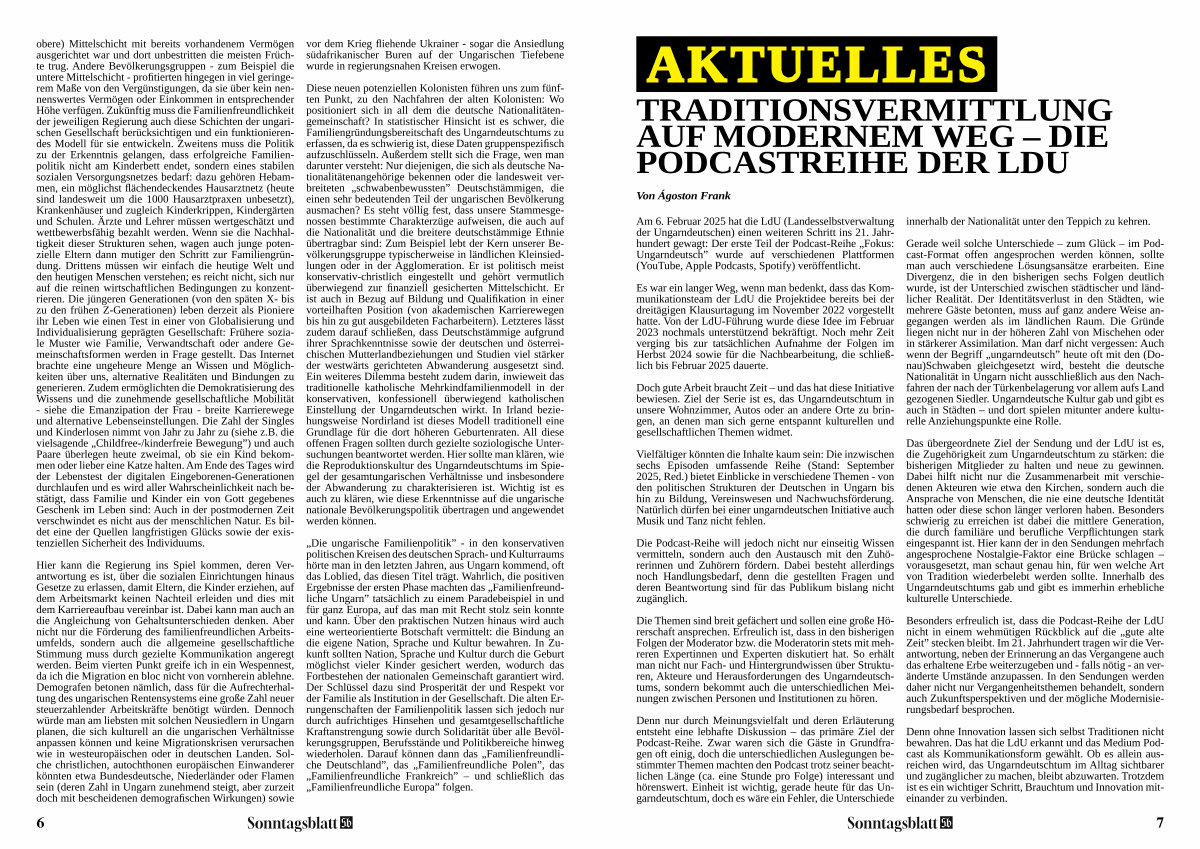 Am 6. Februar 2025 hat die LdU( Landesselbstverwaltung der Ungarndeutschen) einen weiteren Schritt ins 21. Jahrhundert gewagt: Der erste Teil der Podcast-Reihe „ Fokus: Ungarndeutsch” wurde auf verschiedenen Plattformen( YouTube, Apple Podcasts, Spotify) veröffentlicht.
