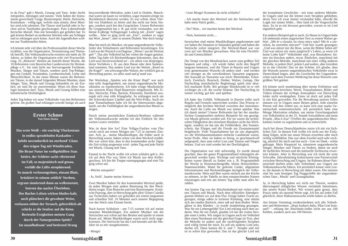 Das erste Weiß – ein wuchtig’ Flockentanz in endlos sprudelnden Kaskaden – belebt novemberlich im sterbend’ Glanz den trägen Tag mit Windtiraden. Die Braut Natur im weißgehüllten Stau betört, der Schleier sacht vibrierend im Fall, so majestätisch und genau, verläßt die Lüfte atrophierend. So manch verlassengrünes, einsam Blatt, brüskiert in seinem zeitlich’ Streben, ergraut sinnierend dann an welkensstatt, betreut das nackte Überleben. Des Baches Lefzen wirken blutlos-kalt; noch plätschert die gewohnte Weise, verlassen stöhnt der Strauch, gebrechlich-alt schickt er die Seufzer auf die Reise. Berieseln Ewigkeiten meinen Gang durch der Naturgezeiten Spiele? Im unaufhaltsam’ und betörend Drang herzzerreißende Melodien, jedes Lied in Dialekt. Manchmal waren sie kaum zu verstehen, sogar mussten einige ins Hochdeutsch übersetzt werden. Es war schön, diese Vielfalt von Dialekten zu hören und das nicht nur beim Singen, sondern auch bei den Gesprächen. Unsere Referentin für Gruppenarbeit hat z. B. gar nicht verstanden, was der kleine 8-jährige Schlagzeuger Ludwig mit „ Eiern” sagen wollte... Aber es ging nicht um „ Eier”, sondern er sagte das Wort „ heuer“, aber in seinem Dialekt. War doch lustig!