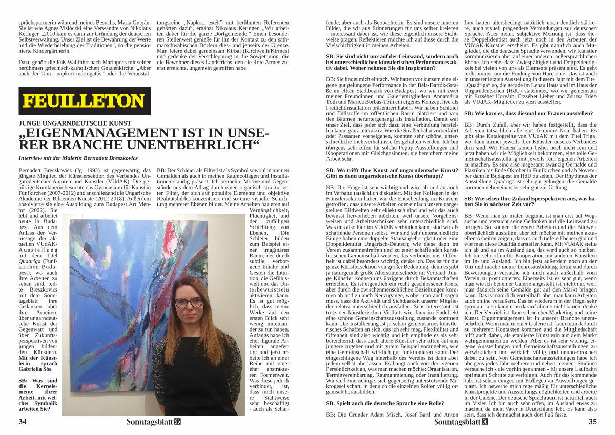 Bernadett Breszkovics( Jg. 1992) ist gegenwärtig das jüngste Mitglied der Künstlersektion des Verbandes Ungarndeutscher Autoren und Künstler( VUdAK). Die gebürtige Kumlauerin besuchte das Gymnasium für Kunst in Fünfkirchen( 2007-2012) und anschließend die Ungarische Akademie der Bildenden Künste( 2012-2018). Außerdem absolvierte sie eine Ausbildung zum Budapest Art Mentor( 2022). Sie lebt und arbeitet heute in Budapest. Aus dem Anlass der Vernissage der aktuellen VUdAK- Ausstellung mit dem Titel Quadriga( Fünfkirchen-Budapest), wo auch ihre Arbeiten zu sehen sind, teilte Breszkovics mit dem Sonntagsblatt ihre Gedanken über ihre Arbeiten, über ungarndeutsche Kunst der Gegenwart und über Zukunftsperspektiven von jungen bildenden Künstlern. Mit der Künstlerin sprach Gabriella Sós.