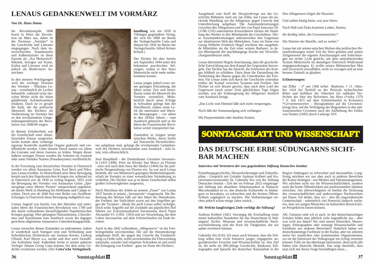 Lenau hat mit seinen epischen Werken den politischen Herausforderungen seiner Zeit die Stirn geboten und seinen Zeitgenossen die eigenen Anschauungen und Anfechtungen ins rechte Licht gerückt, um dem unterdrückenden System Metternichs im damaligen Österreich Widerstand entgegenzubringen. Er wollte seinen Mittmenschen Mut und Zuversicht einzuflößen, nicht zu verzagen und an eine bessere Zukunft zu glauben.
