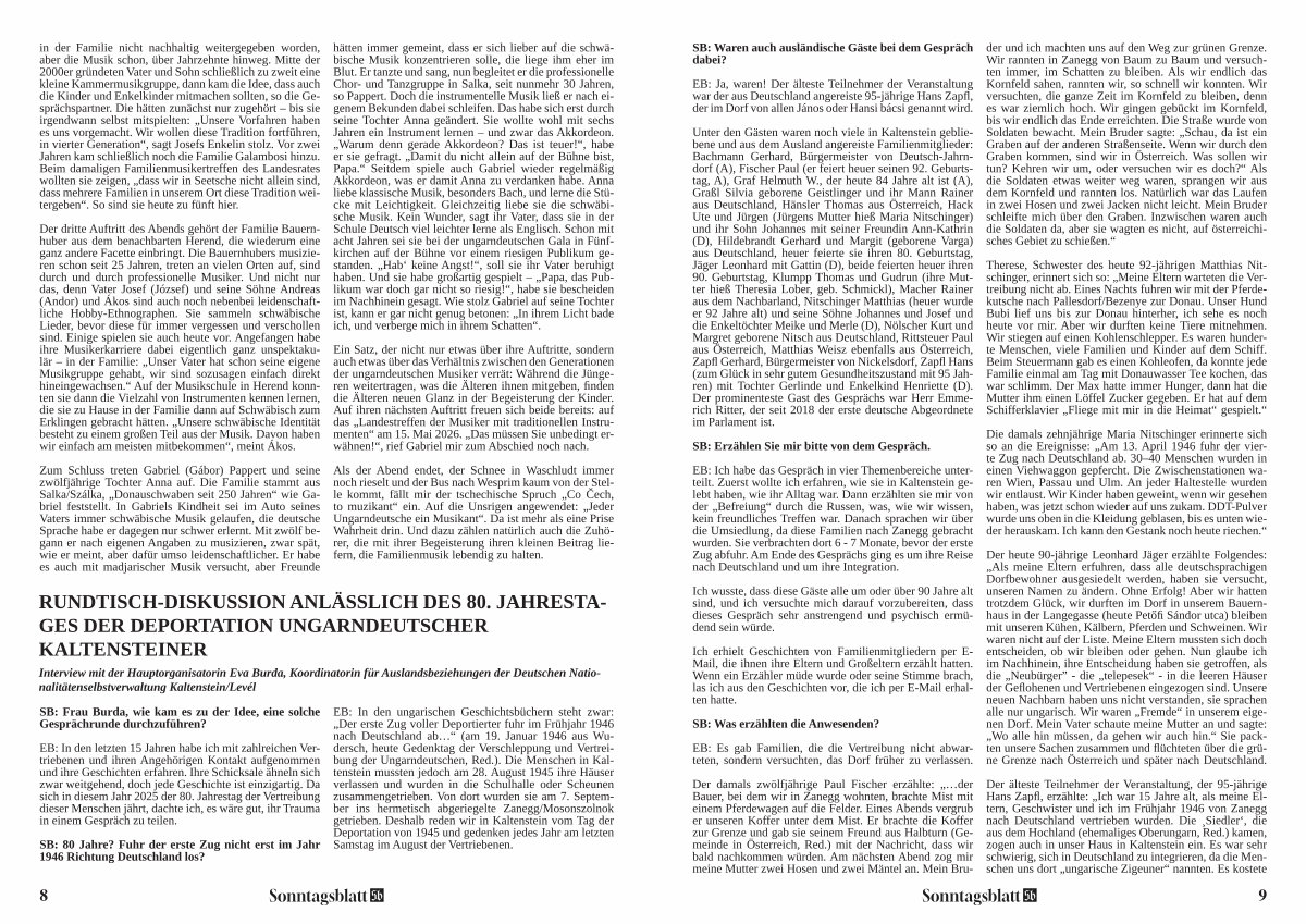 Unter den Gästen waren noch viele in Kaltenstein gebliebene und aus dem Ausland angereiste Familienmitglieder: Bachmann Gerhard, Bürgermeister von Deutsch-Jahrndorf( A), Fischer Paul( er feiert heuer seinen 92. Geburtstag, A), Graf Helmuth W., der heute 84 Jahre alt ist( A), Graßl Silvia geborene Geistlinger und ihr Mann Rainer aus Deutschland, Hänsler Thomas aus Österreich, Hack Ute und Jürgen( Jürgens Mutter hieß Maria Nitschinger) und ihr Sohn Johannes mit seiner Freundin Ann-Kathrin( D), Hildebrandt Gerhard und Margit( geborene Varga) aus Deutschland, heuer feierte sie ihren 80. Geburtstag, Jäger Leonhard mit Gattin( D), beide feierten heuer ihren 90. Geburtstag, Klumpp Thomas und Gudrun( ihre Mutter hieß Theresia Lober, geb. Schmickl), Macher Rainer aus dem Nachbarland, Nitschinger Matthias( heuer wurde er 92 Jahre alt) und seine Söhne Johannes und Josef und die Enkeltöchter Meike und Merle( D), Nölscher Kurt und Margret geborene Nitsch aus Deutschland, Rittsteuer Paul aus Österreich, Matthias Weisz ebenfalls aus Österreich, Zapfl Gerhard, Bürgermeister von Nickelsdorf, Zapfl Hans( zum Glück in sehr gutem Gesundheitszustand mit 95 Jahren) mit Tochter Gerlinde und Enkelkind Henriette( D). Der prominenteste Gast des Gesprächs war Herr Emmerich Ritter, der seit 2018 der erste deutsche Abgeordnete im Parlament ist.