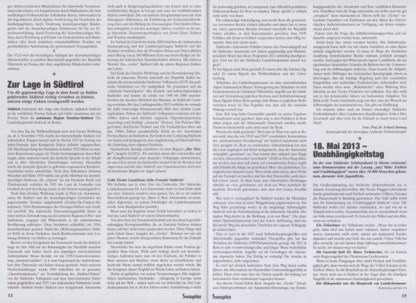 Nachstehende Beiträge entnehmen wir dem Magazin „ Der Tiroler ” ( Ausgabe 62 / 2013 ). Wir möchten damit den Lebenswillen und die Kampfbereitschaft einer deutschen Volksgruppe demonstrieren , die nun schon bereits ein Jahrhundert hindurch für ihr Bestehen hart ringen muss und die ( also Südtirol !) uns Ungamdeutschen doch stets als leuchtendes Beispiel vor Augen schwebt .