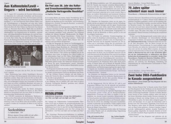 Am 31 . August 2013 veranstaltete die Deutsche Selbstverwaltung von Kaltenstein die traditionelle Gedenkfeier und Kranzniederlegung für die Vertriebenen des Ortes . Zur Feier kamen auch ehemalige Ungarndeutsche aus Österreich und aus Deutschland . Wir begrüßten u . a . aus Gols / Österreich Herrn Helmut Walter Graf , den Verbindungsmann zu Burgenland und seine liebe Gattin , Herrn Pfarrer Schrödl und seine Begleitung aus Deutschland und Österreich , Herrn Dr . Pater Othmar aus Österreich , Frau Julianna Csáfor , ev . Reverend , Herrn Pfarrer Miklós Kiss aus Straßsommerein / Hegyeshalom und insbesondere Herrn Richard Tircsi , den Abteilungsleiter vom Staatssekretariat für kirchliche- , nationalitäten- und zivilgesellschaftliche Beziehungen , der auch die Festrede hielt . Selbstverständlich waren auch der Herr Bürgermeister von Levél , Herr Zoltán Pap , die Schuldirektorin Frau Gyöngyi Fenyvesi , die Kindergarten-Direktorin Frau Kovácsné Varga Éva , viele Vertreter der Kaltensteiner Gemeide , die Vorsitzenden der Kaltensteiner Zivilen Vereine und viele Gäste auch mit dabei .